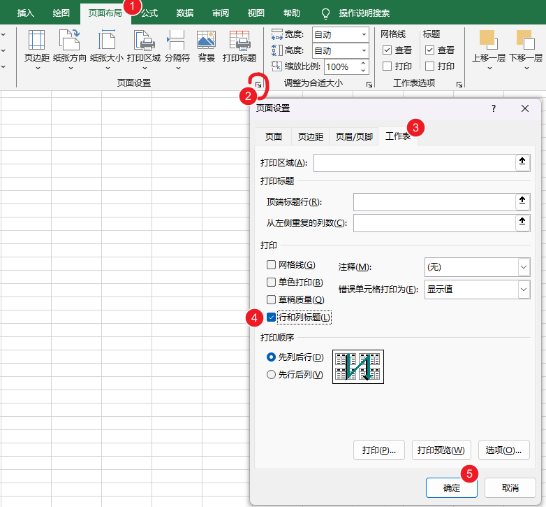 在电脑中查看excel和WPS表格的工作表时,能看到行号(12345…..)和列标(ABCDE…),但是打印出来以后默认是没有行号和列标的,如果要让打印(或者转为PDF)出来以后仍能看到行号列表,可以在页面设置中简单设置一下即可。这样可以无需在数据表中插入字段/标题就可以方便查看和定位数据。