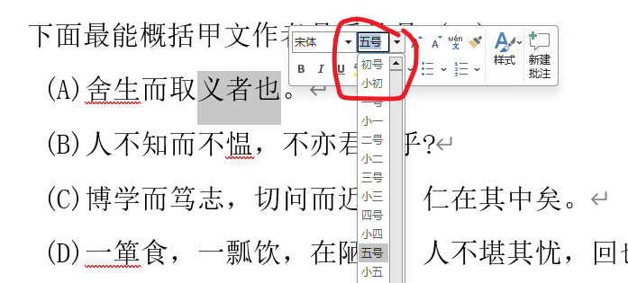 一、调整字号的通常做法:选择文字后,通过字号下拉框选择