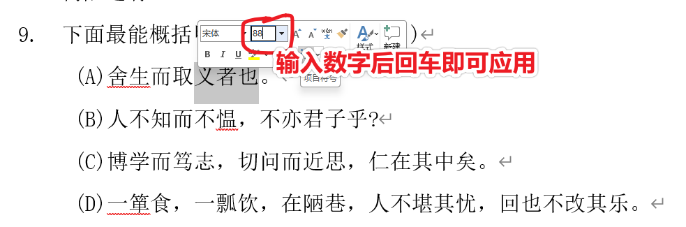 选中文字后,直接在字号框手动输入阿拉伯数字,比下拉框选择更快,且可以输入更大的数字: