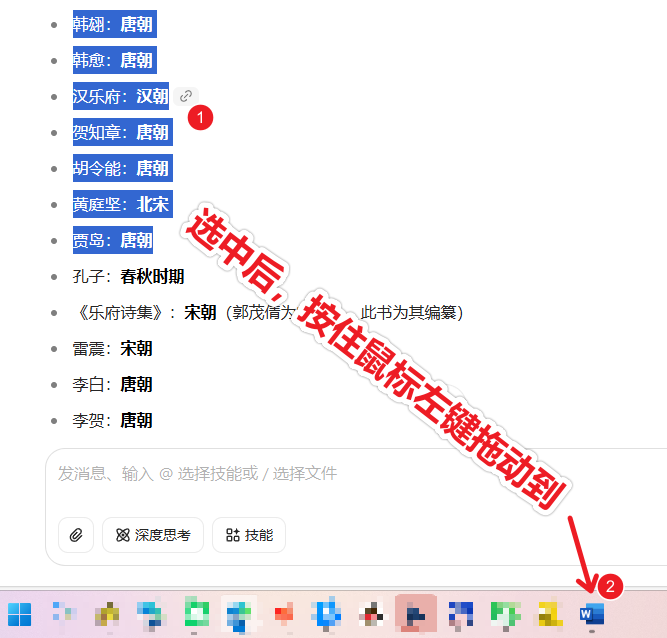 操作方法一:选中文字后拖动到任务栏的程序-文档