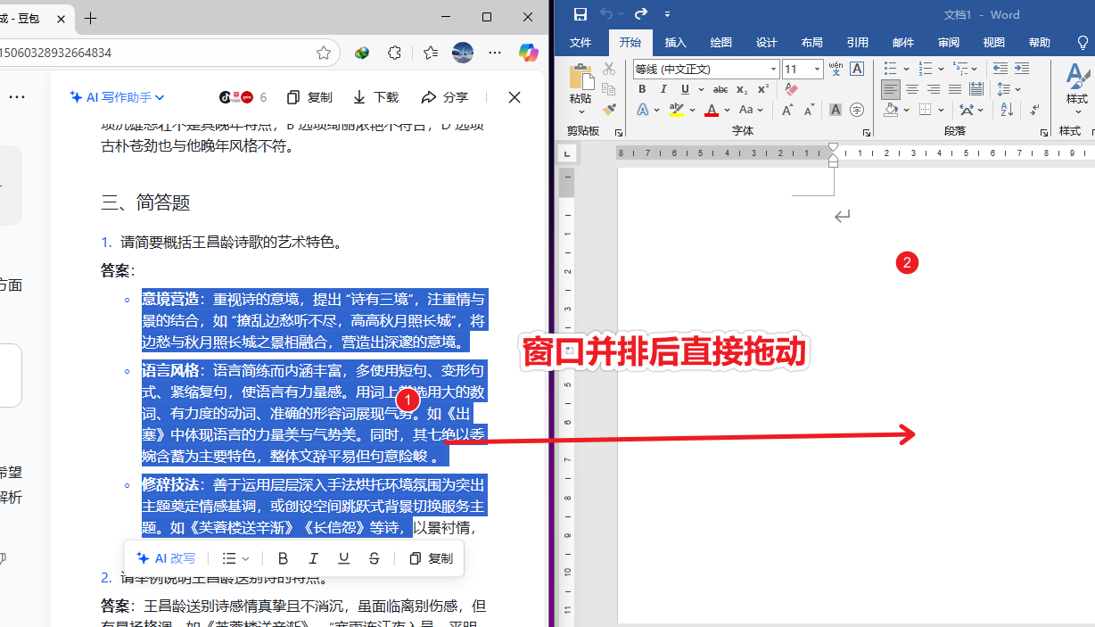 操作方法二:将两个窗口并排,直接在屏幕上拖动文字