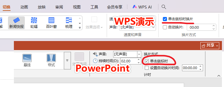 在PowerPoint和WPS演示的选项卡中,切换-换片方式-单击鼠标时。两个软件的名称略有不同,功能一模一样。