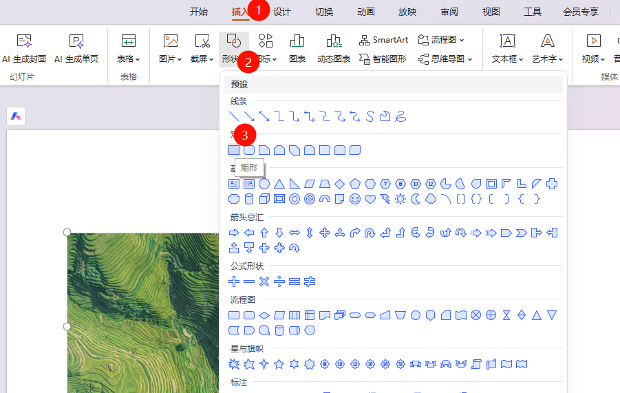 插入选项卡-图形和图像-形状-矩形,然后鼠标左键拖动调整到图片上方,调整为和图片一样大小。