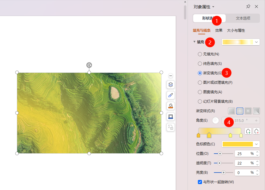 选中矩形,形状的属性这里,设置渐变填充,选择填充的颜色、效果和透明度等。