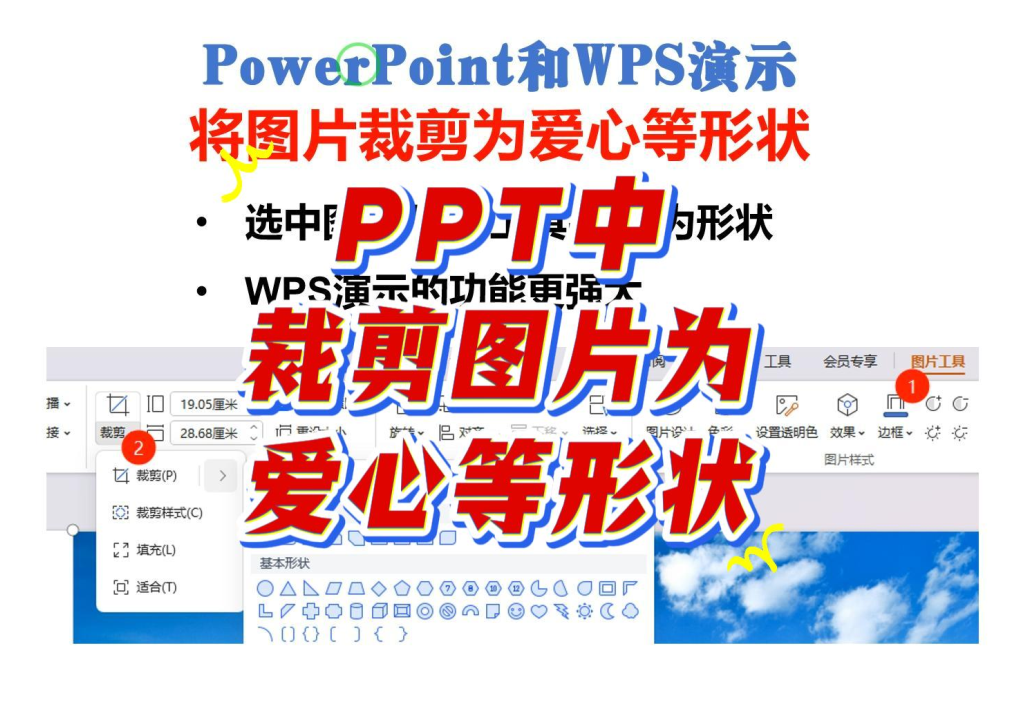 在WPS演示和PowerPoint中,使用裁剪功能,可以将插入的图片裁剪为各种形状,例如心形、五角形、云朵形等等。WPS演示还可以指定裁剪的位置,更加灵活。