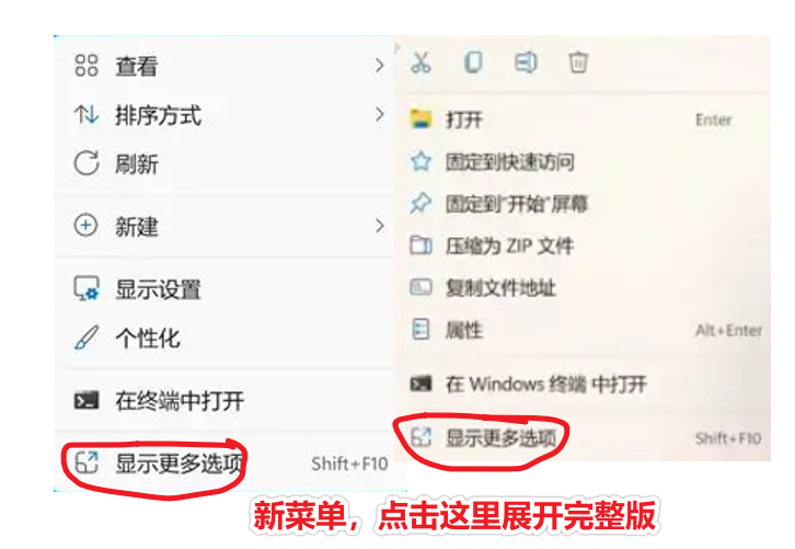 升级到Windows11后,默认的鼠标右键菜单是简版的,如果需要像以前那样的完整版右键菜单,需要点击新菜单底部的显示更多: