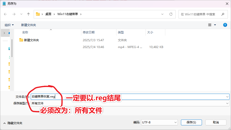 3、点击保存,保存为.reg格式的文档,文件类型选择:所有文件 (这两步非常关键哦)