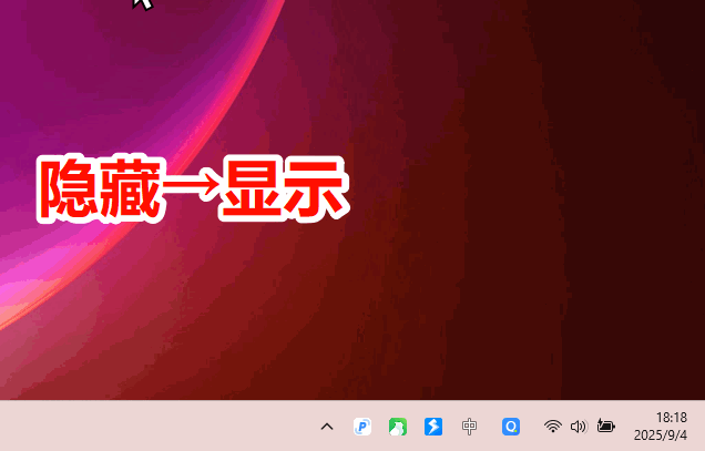 在系统托盘区域,如果要把一个应用图标从隐藏变成显示,只需要点击三角形打开隐藏区域,找到应用图标,长按鼠标左键拖动到显示区域合适的位置,松开鼠标即可。