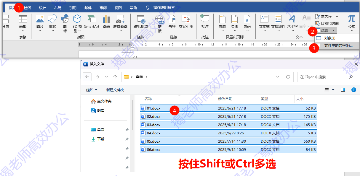 在弹出的对话框中选中需要插入的文档,就会根据顺序依次插入。